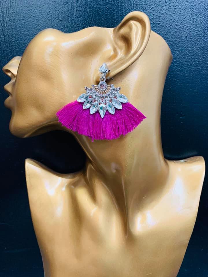 Magenta fan style tassel earring with silver and diamonte detail.